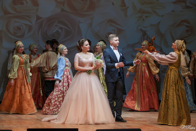 Жених — артист хора вокально-хореографического ансамбля «Русь» Дмитрий Васильев, невеста — солистка музыкально-просветительского театра Екатерина Прохорова. Свадьба — не постановочная, а самая что ни на есть настоящая. Артисты давно любят друг друга и планировали пожениться следующим летом. Однако за две недели поменяли планы.
