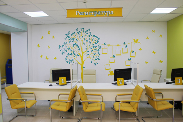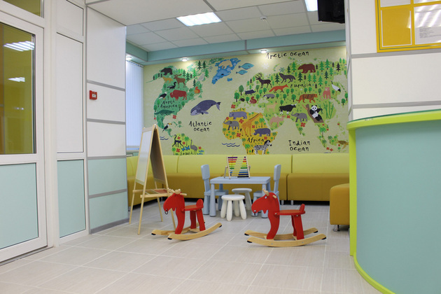 В регистратуре больше нет барьера между пациентом и медицинским работником. Места ожидания украшены яркими рисунками. Появилась игровая зона и удобные пеленальные столики.