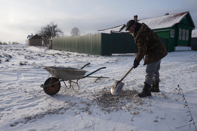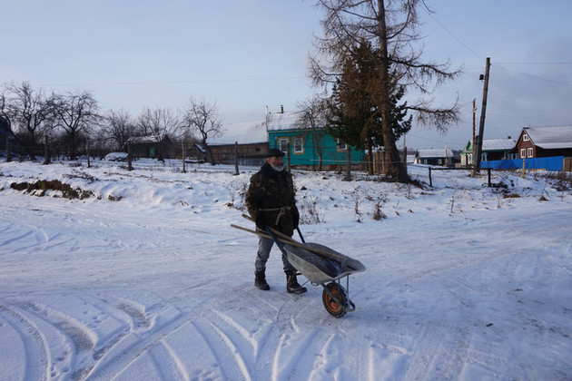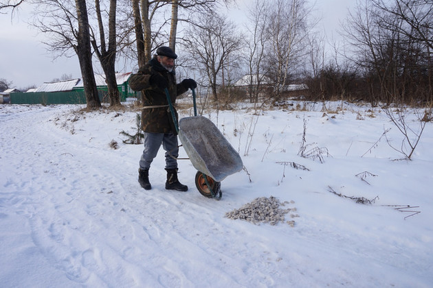 Он был первым, кого мы увидели в Новосёлках: невысокий седовласый мужчина толкал тележку с инструментом.