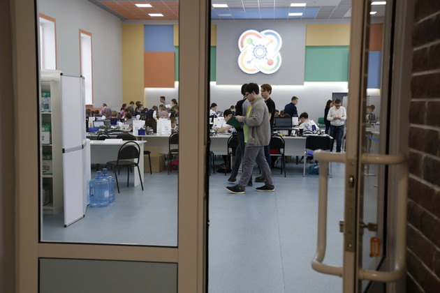 ...На «полигоне» (так называют в «Кванториуме» огромную площадку для экспериментов) буквально кипела конкурсная жизнь. На арену, где соревновались дети, взрослых не пропускали, для них была организована видеотрансляция. Всем процессом конкурса управляли студенты-волонтеры.