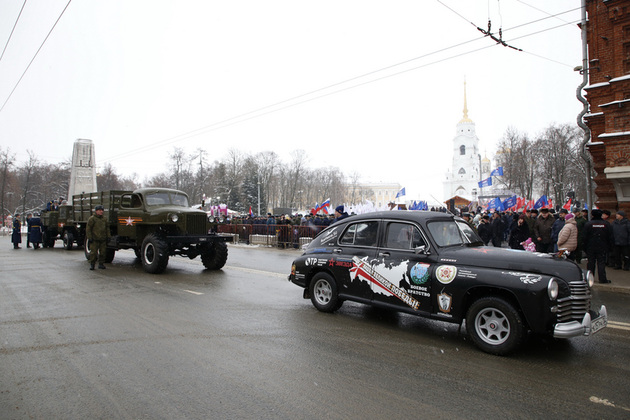Курсанты Владимирского юридического института на ретромобиле ЗИС-5 доставили к Вечному огню на площади Победы корзину с цветами и гирлянду в память о павших. А кульминацией митинга стало развертывание юнармейцами на Соборной площади масштабной копии Знамени Победы.