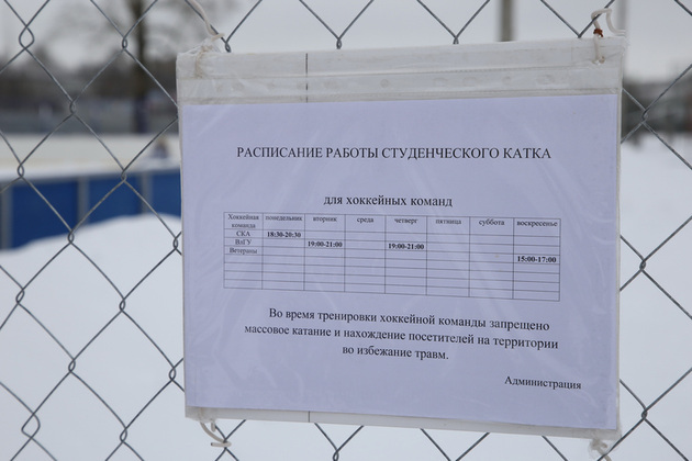 Этот довольно просторный каток заливают на футбольном поле. Но вот по цене катания бьет рекорды открытых площадок - 200 рублей для взрослых и 100 рублей для детей. Прокат коньков – 50 рублей. Работает он с 8.00 (по будням) и с 9.00 (по выходным) до 21 часа.