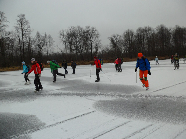 Но если для ледового шоу в Доброграде каток все же заливали поверх естественного льда, то владимирцы катались прямо по зеркалу водной глади. Они не выделывали пируэтов, они путешествовали, как голландцы в былые времена по льду каналов. Прошедшей осенью, которая затянулась до Нового года, ребята совершали походы на коньках длиной в несколько километров по Содышке и по озерам Давыдовской поймы.