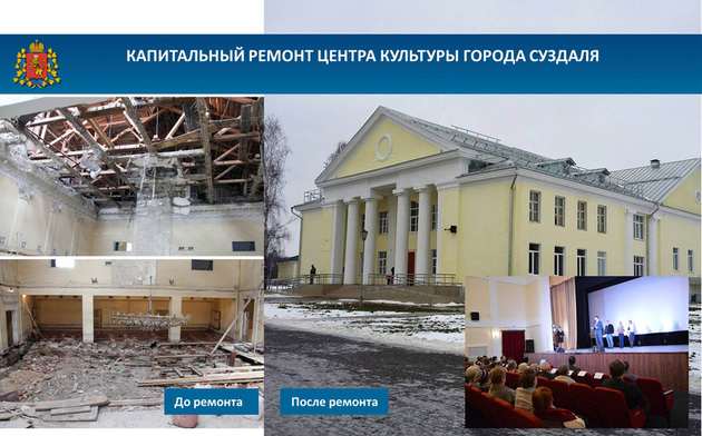 К примеру, завершен ремонт Петушинского районного Центра культуры и искусств. В 2017 году начато строительство сельского клуба в селе Павловском Ковровского района. Проведен капитальный ремонт Центра культуры Суздаля, Черкутинского ДК Собинского района и Федоровского ДК Киржачского района.