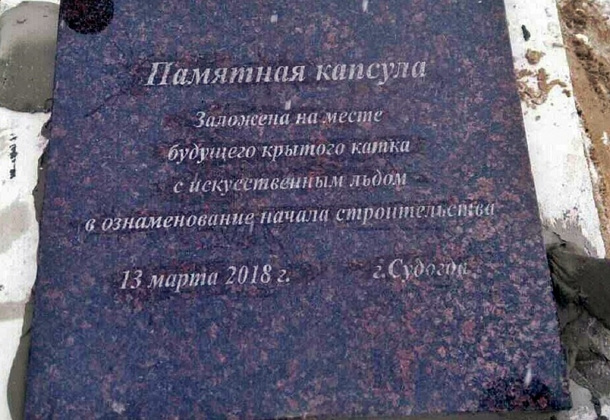 Администрация Судогодского района оперативно исправила грамматические, пунктуационные и фактические ошибки на мемориальной доске на месте будущего ледового дворца в Судогде.
