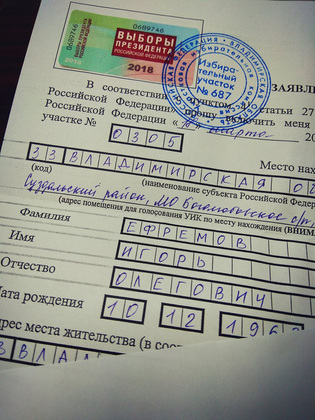 - Открепительное пришлось брать, чтобы поучаствовать в выборах президента по реальному месту жительства, - объяснил Ефремов. - Я был первым избирателем с открепительным удостоверением на участке.