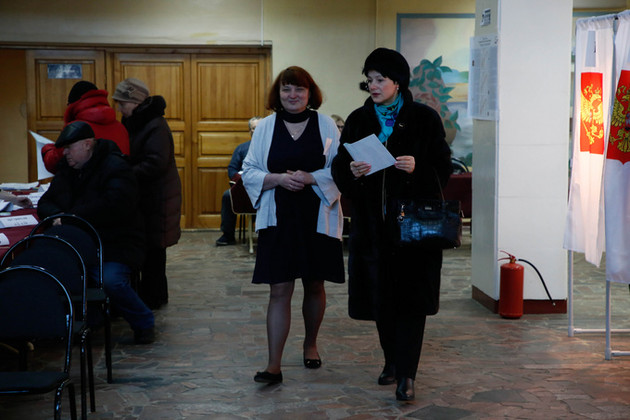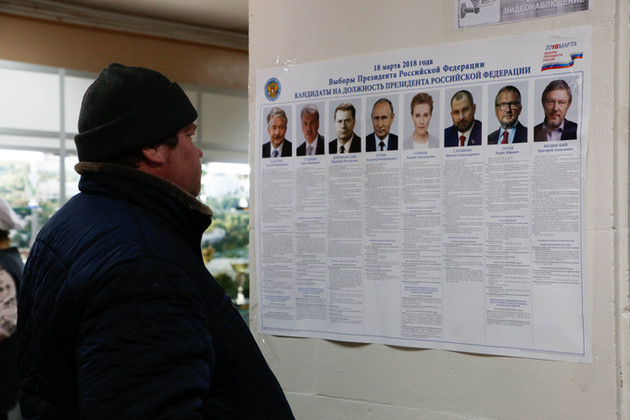 У стенки скучал полицейский: голосование шло мирно. Вместе с ним взглядом провожают избирателей до урны наблюдатели от кандидатов Путина и Грудинина.