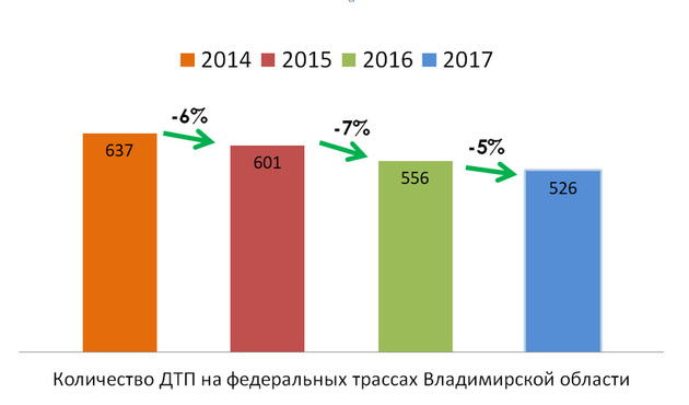 В 2017 году федеральные дорожники установили более трех километров осевого барьерного ограждения, построили шесть надземных и два подземных пешеходных перехода. Было отремонтировано четыре моста, более 17 км дороги и около 40 км линий электроосвещения. Работы проводились сразу на нескольких участках автомагистрали М-7 «Волга» на территории Петушинского, Собинского, Камешковского, Вязниковского районов и города Владимира.