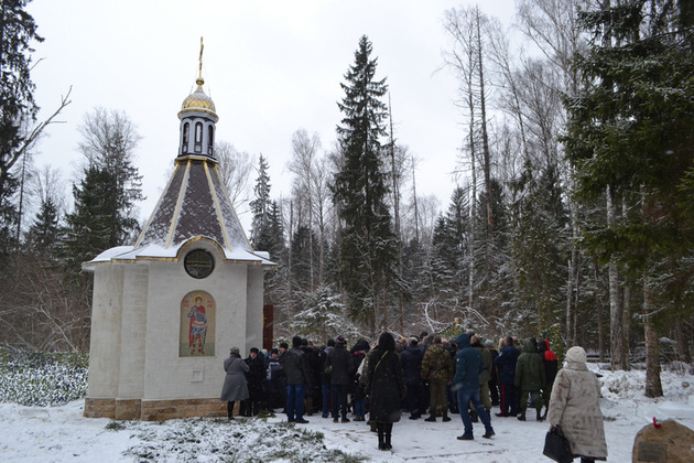 С обряда освящения часовни, который провел архиепископ Александровский и Юрьев-Польский Евстафий, и началась череда памятных событий в этот день. Часовня совсем небольшая, расположена как раз напротив главной стелы мемориала, установленной в 1975 году на месте падения самолета Гагарина и Серегина.