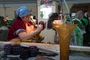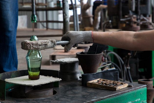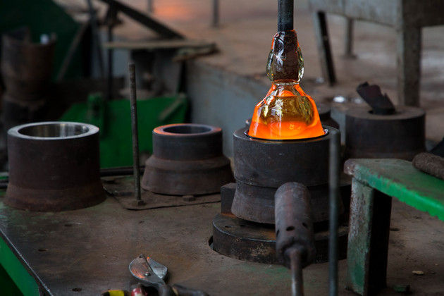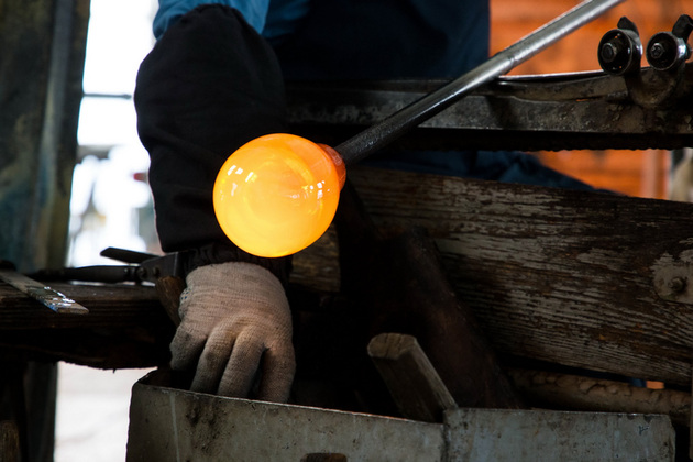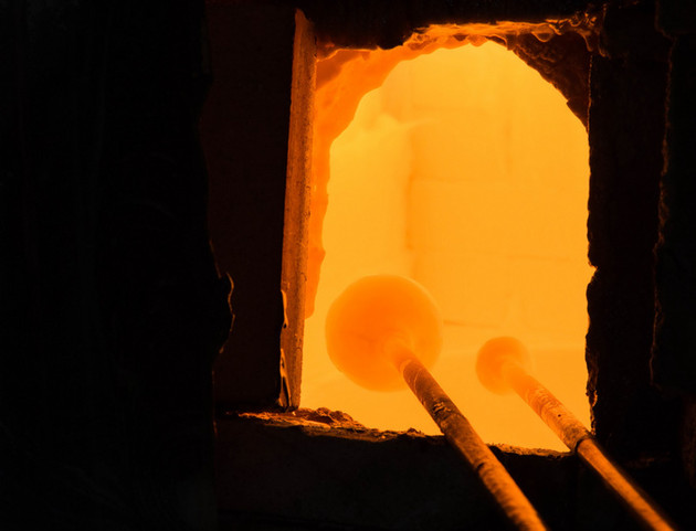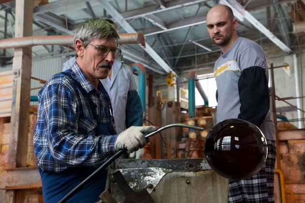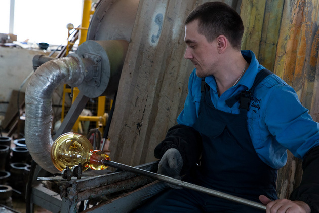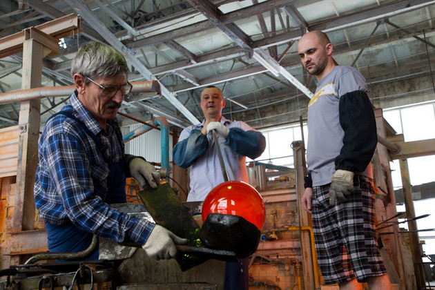 Из жерла стекломассу достают длинной трубкой. Отточенными движениями переносят к форме, постоянно переворачивают, подкручивают, чтобы стекломасса не утекла и раньше времени не остыла. В каждом движении - четкость.