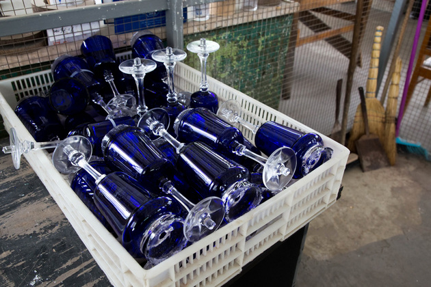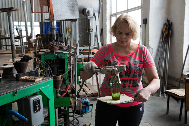 Опытный выдувальщик Сергей Дубровин, работающий по соседству с основными силами бригады Гусева, при нас за несколько минут сотворил несколько цветных стаканов. Помощница перенесла их в лер, а оттуда они поступят для дальнейшей обработки.