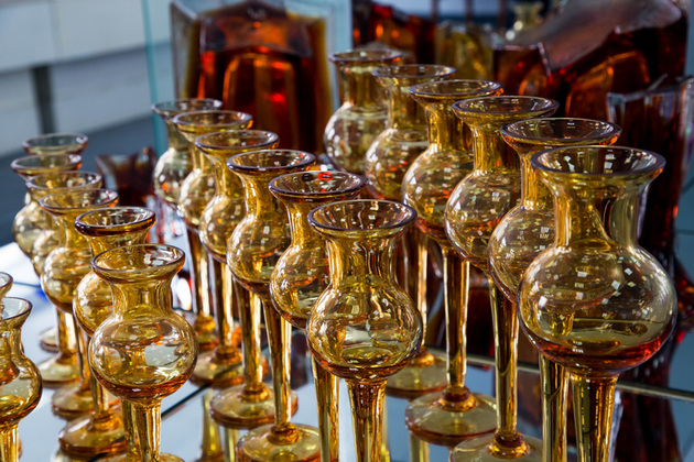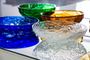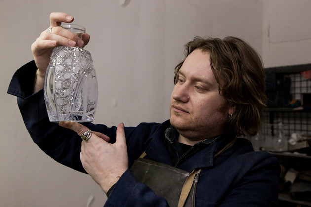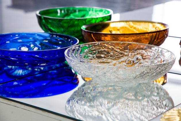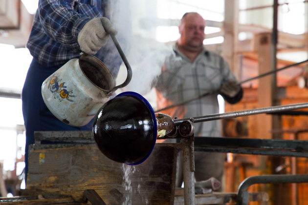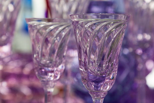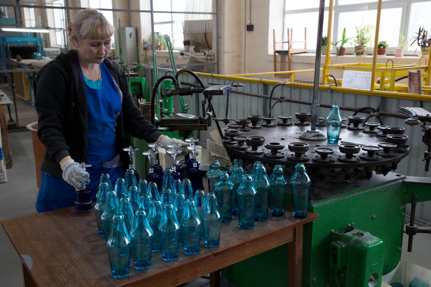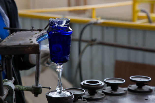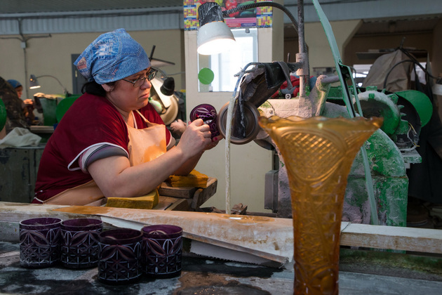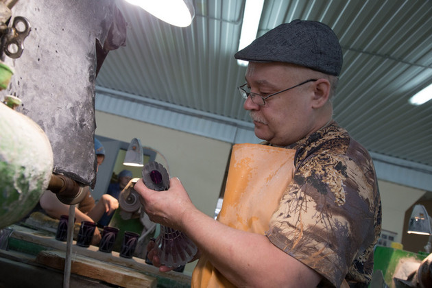 В новейшей истории завод сделал ставку на яркость - однотонные цветные изделия или изделия с цветным накладом. В производстве они сложнее, но результат стоит усилий. Мастер опускает бесцветную каплю хрусталя в центробежку, где уже замешан цвет. Ярко и быстро два слоя соединяются: цветной наклад обволакивает бесцвет. Позже наклад украсят рисунком - прорежут грани, сквозь которые засияет прозрачный хрусталь.