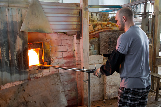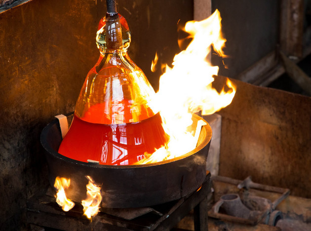 На возвышении-полукружье бурлят печи, поигрывая апельсиновым пламенем. В печных горшках варится стекломасса - основа будущих шедевров.
