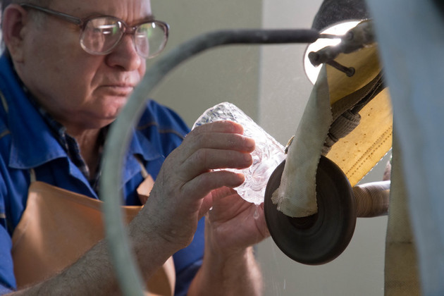 Для начала стаканы избавят от колпаков - верхней части изделия, где была стеклодувная трубка. Для этого стакан помещают на вращающуюся подставку к пламени газовой горелки. После среза изделие проходит первый контроль качества: нет ли больших пузырей, камней, кривизны ножки, достаточна ли толщина у стекла. Все в порядке? Тогда милости просим - на алмазный участок, за бриллиантовыми гранями к мастерам-шлифовщикам.