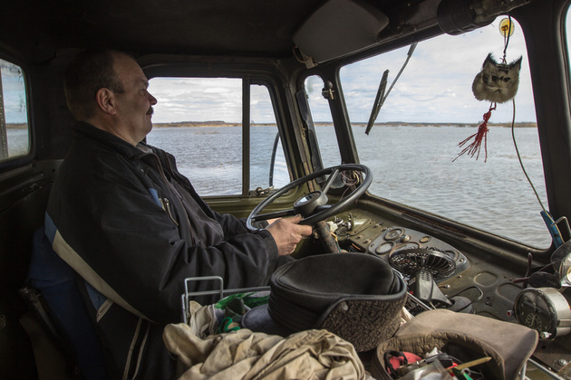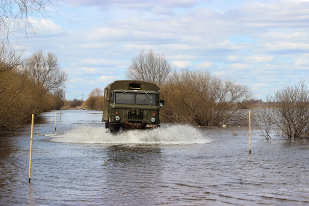 Трансфер до Заречья пока занимает минут пятнадцать, но если Клязьма сильно разольется, то время в пути может увеличиться до получаса и больше. Мы мчимся на транспорте МЧС. Ветрено и с непривычки не очень уютно. Не до красот, хотя разлив впечатляет, на реке - тишина, слышен только шум мотора. На противоположном Вязникам берегу стоит несколько легковых авто, но для нас приготовлен спецтранспорт - видавший виды «ГАЗ-66», выкрашенный в армейские цвета. Владелец машины и шофер - местный пенсионер Сергей Лагутин. С ним администрация тоже заключила договор на перевозку людей и грузов. Вместимость автомобиля - 22 пассажира, но по словам Сергея Константиновича, ежедневно он возит до переправы и обратно человек десять, по понедельникам - народу побольше, а в зимний разлив почти всегда был полный «салон».