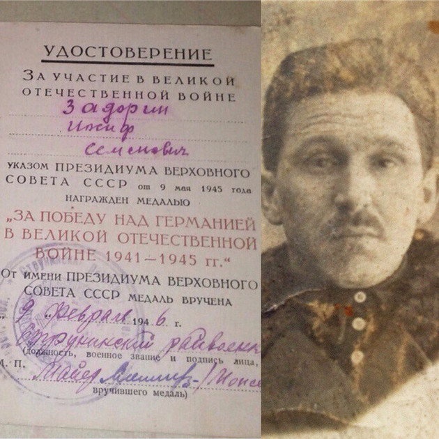 Второй дедушка, Иосиф Семенович Задорин, уроженец Саратовской области, 1903 г. р., прошел всю войну. Был артиллеристом. Громил фашистов на знаменитых «Катюшах» и дошел до Берлина. Участвовал в Параде Победы в 1945 году. Имел благодарность от Сталина. К сожалению, все его награды были утеряны после пожара дома. После возвращения домой он работал портным – шил верхнюю мужскую одежду. С заказами к нему приходили жители всего города Струнино. Я хорошо помню его. Несмотря на строгий характер, мужскую немногословность, он был заботливым и любящим дедом. Долго болел – сказались годы войны. Умер в 1975 году.