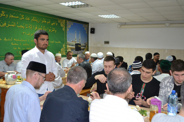 Пришедшие на ифтар собираются в залах для молитвы (у мусульман мужчины и женщины молятся в разных помещениях). Как только наступило астрономическое время захода солца, верующим и гостям подали воду и финики. Затем совершилась вечерняя молитва - намаз. И только потом все приступили к основному угощению. Главным блюдом в тот вечер была шурпа — картофельный суп с мясом, объединяющий и первое, и второе блюда.