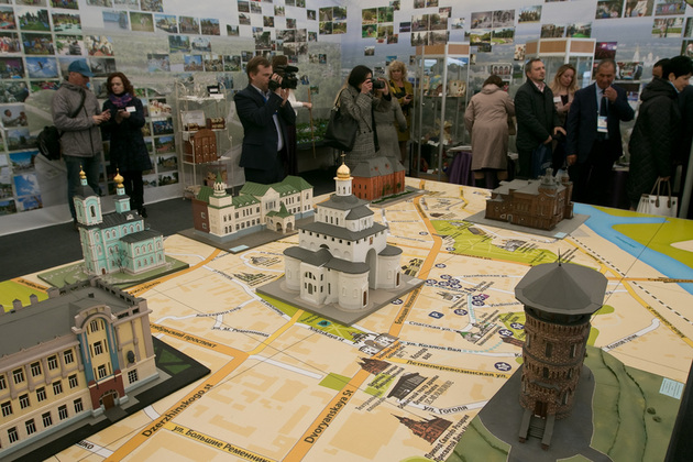 В городском выставочном шатре, например, были представлены примеры реновации городской среды и развития туристической инфраструктуры: новые скверы, результаты реконструкции Патриаршего сада, развитие пешеходного кластера, светодиодное уличное освещение с технологиями «умного города», проект уличной туристской навигации в партнерстве с Ростелекомом, а также перспективные мегапроекты развития исторического центра: построенная уже Лыбедская магистраль и перспективная набережная реки Клязьмы.