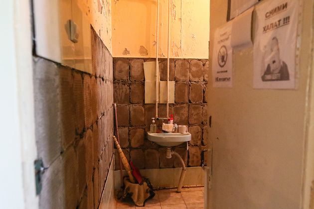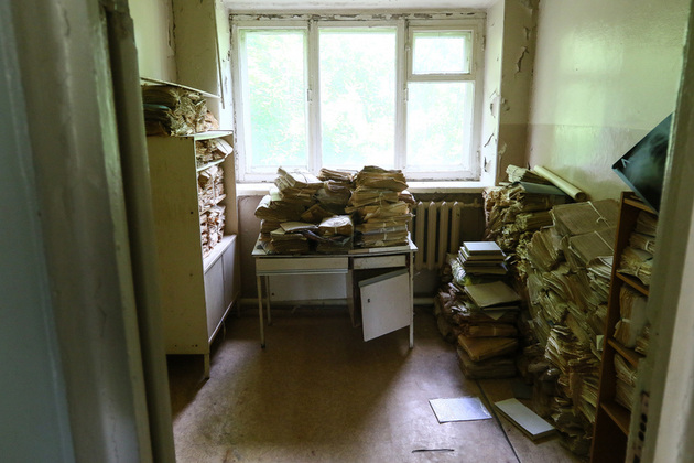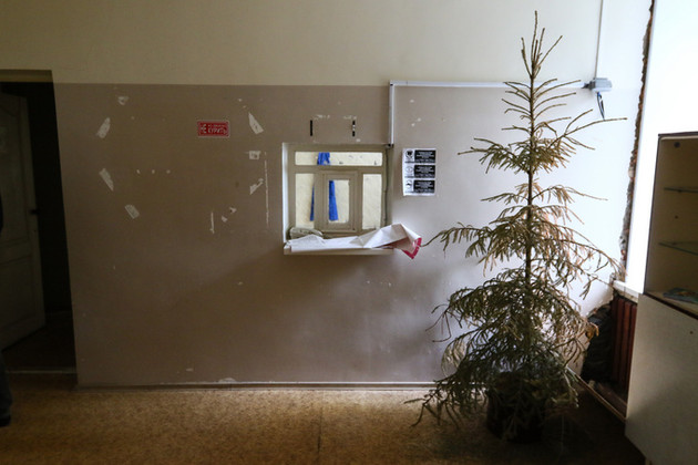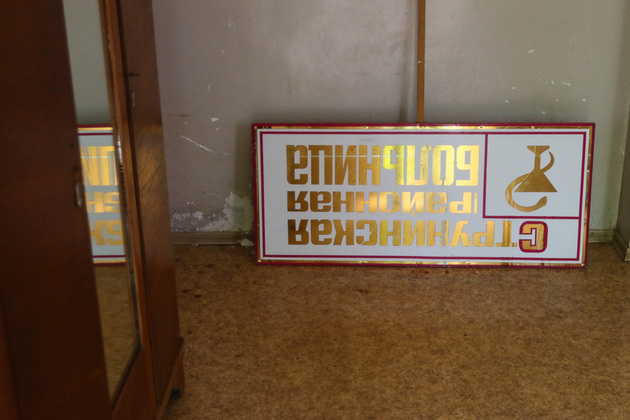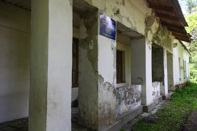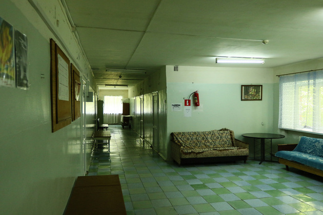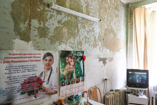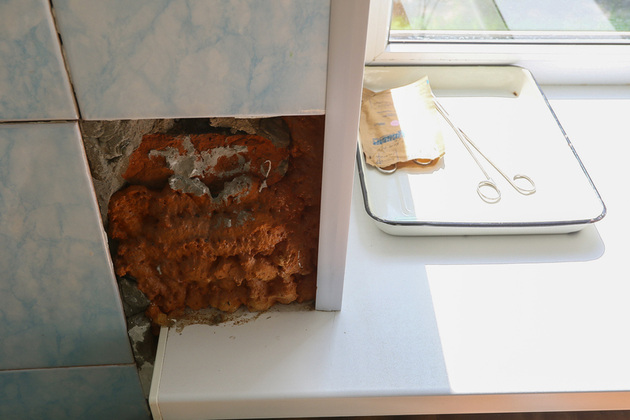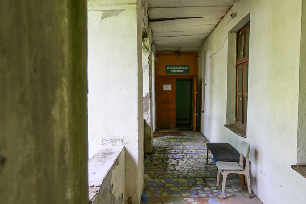 Теперь на том же месте мы. Куски отвалившейся штукатурки создают впечатление разрухи. Внутри завотделением Сергей Овчинников показывает объем бедствия: со стен сыплются слои краски, подтеки на потолках. В его кабинете на стене дыры прикрыты картинами. Старый кабинет с табличкой «Мазевая» закрыт по настоянию санитарных врачей, они запретили здесь принимать пациентов. Есть новая «Мазевая», отремонтированная.