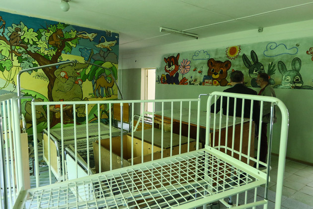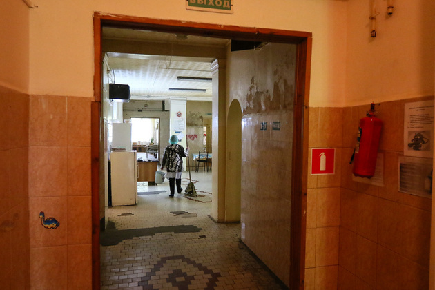 Здесь до 2015 года был детский дневной стационар, детское инфекционное отделение дневного пребывания. Кажется противоречие: инфекционное и дневное трудно совместить. Но так было. Тут лечили бронхиты, ОРВИ, прочие болячки, с которыми можно было на ночь уйти домой. Сейчас здесь откровенное запустение. Койки сдвинуты, матрасы сложены высокой горой. На стенах и потолках коричневые подтеки. О том, что здесь лечили детей, напоминают лишь кроватки для малышей и стены, разрисованные сюжетами про доктора Айболита.
