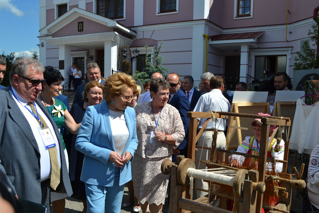 Перед началом форума Матвиенко и Орлова осмотрели выставку, где была представлена и тема культурной столицы ЧМ. Муниципалитеты презентовали свои усилия по сохранению старины, ремесел, развитию туризма: Суздаль, Гороховец, Муром, Юрьев-Польский, Ковров...