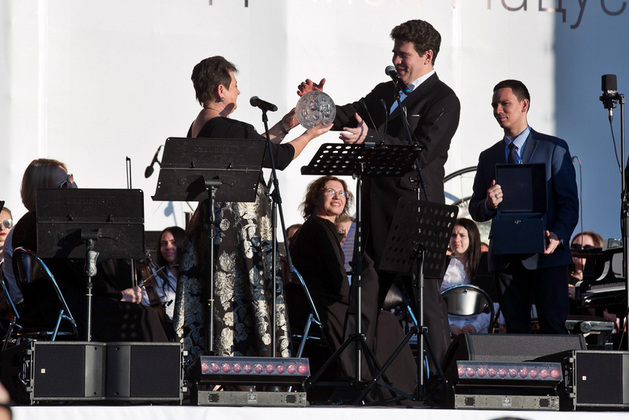 На сцене фестиваля «Alma Mater», проходящего, кстати, в рамках культурной программы мундиаля-2018, губернатор Светлана Орлова вручила музыканту необычный подарок - хрустальный футбольный мяч, изготовленный мастерами «Гусевского хрустального завода».