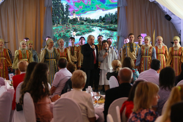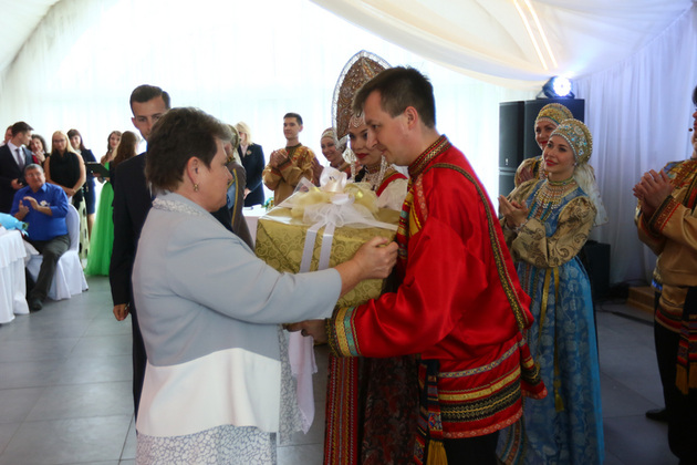 Зал тепло приветствовал пару, которая 27 июля собралась пожениться. Ведущих артистов ансамбля «Русь» Антона Родина и Олесю Мостолыгину по традиции песнями и танцами «величали» их коллеги. И всем семьям - участницам торжества вручили дипломы, хрустальные ладьи и ещё один подарок от губернатора – экскурсия в музейно-досуговый комплекс села Маринино, в усадьбу Танеевых.
