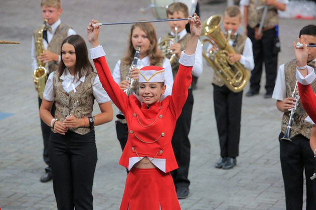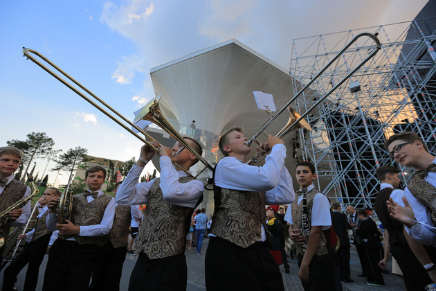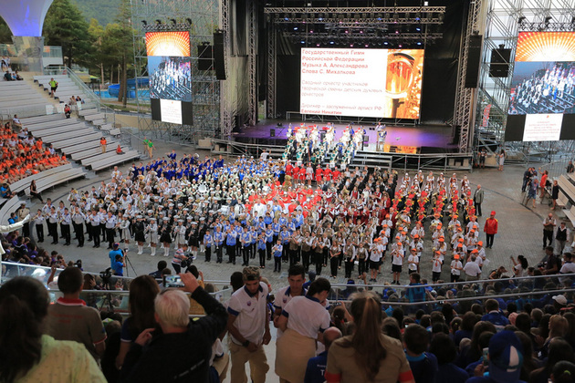 На Артек-Арене оркестры со всей России представили номера для плац-дефиле, во время которых звучали известные детские мелодии, музыка из кинофильмов, популярные произведения русских и зарубежных композиторов. Фееричным стало выступление сводного оркестра из 500 юных духовиков.