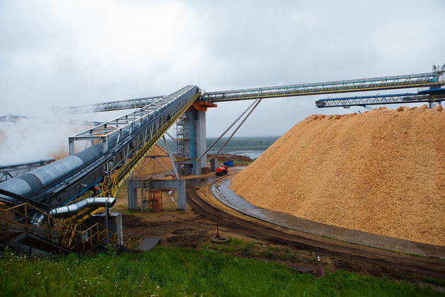 Понятно, что деревья в варочные машины не бросают. Их дробят, получая сырье — щепу. Для ее хранения построен отдельный склад. Щепа из отходов вырубки, лиственных и хвойных, может лежать и на открытом воздухе.