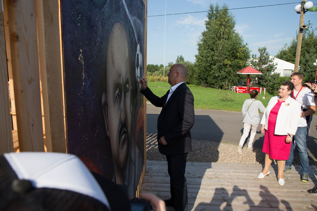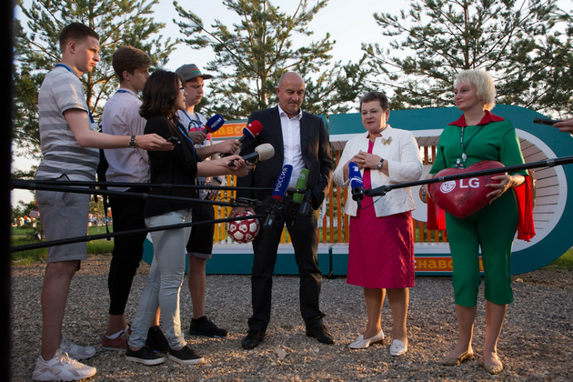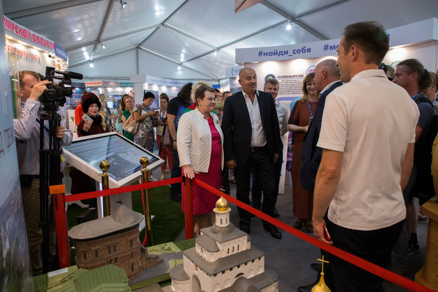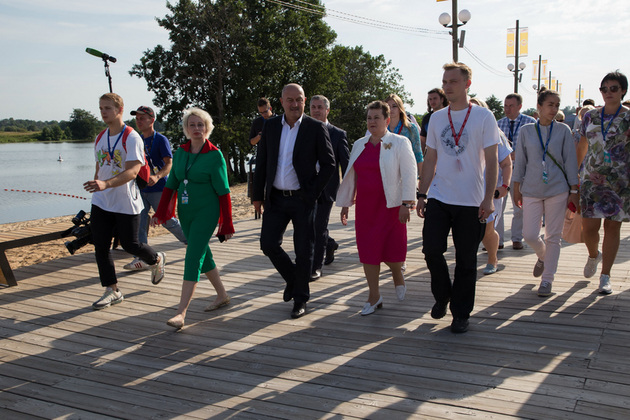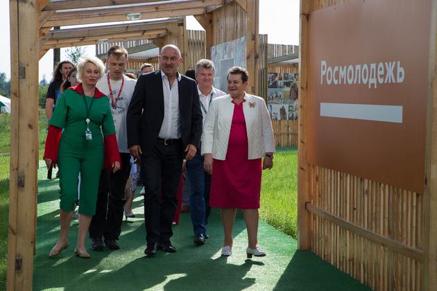 Еще до встречи с форумчанами Черчесов успел основательно осмотреть шатер с достижениями Владимирской области, который работает при входе на территорию всероссийского форума-лагеря. Экскурсию для него провела Светлана Орлова. Черчесова искренне интересовало все: и сувениры, подготовленным в регионе в рамках проекта «Владимир — культурная столица ЧМ-2018», и информация о наших древних городах, университет, Доброград и даже наш новый ковровский трактор.
