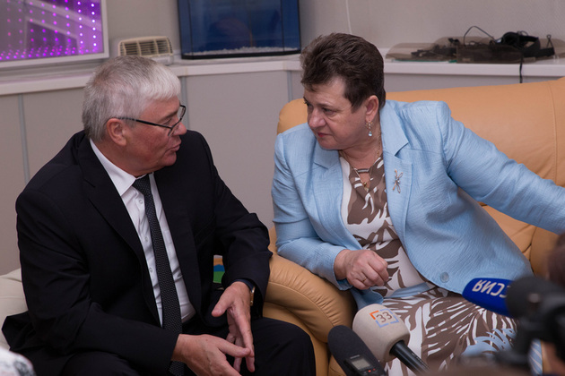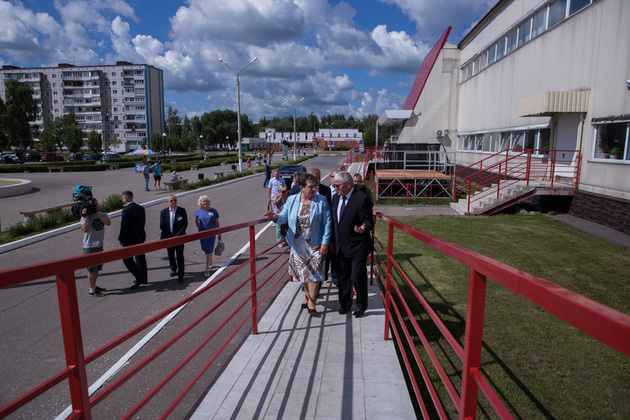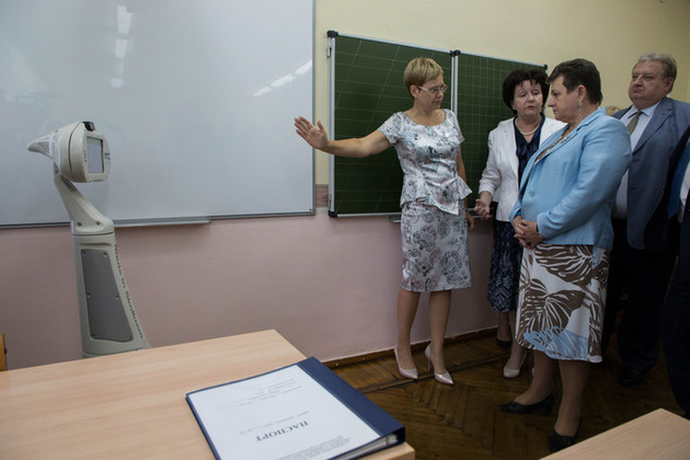 Начальник управления образования ЗАТО Радужный Татьяна Путилова провела гостей по школе. Губернатора особенно впечатлил класс, где занимается девочка с ограниченными возможностями. Для нее школа четыре года назад сначала оборудовала пандус (она колясочница), а потом в классе появился робот-помощник (всего их в школе два).