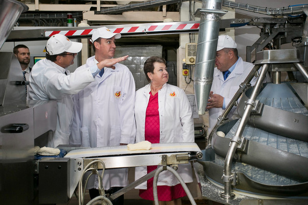На Владимирском хлебокомбинате Патрушев осмотрел производственные линии по изготовлению хлебобулочных изделий, цех мучных изделий с двумя не имеющими аналогов в Европе автоматизированными технологическими линиями бараночных и сушечных изделий, и цех по выпуску продукции по технологии глубокой заморозки. Объём инвестиций в новые производства превысил 500 миллионов рублей. А вкус и запах традиционного владимирского батона, только что сошедшего с конвейера, просто потряс министра: