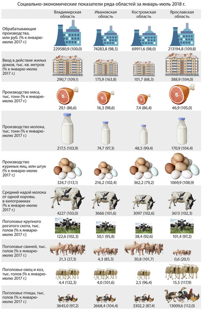 К 1 августа (по сравнению с соответствующей датой 2017 года) во Владимирской области увеличилось поголовье: коров - на 1,7%, овец и коз - на 32,3%, сократилось поголовье: свиней - на 72,7%, птицы - на 2,8%.