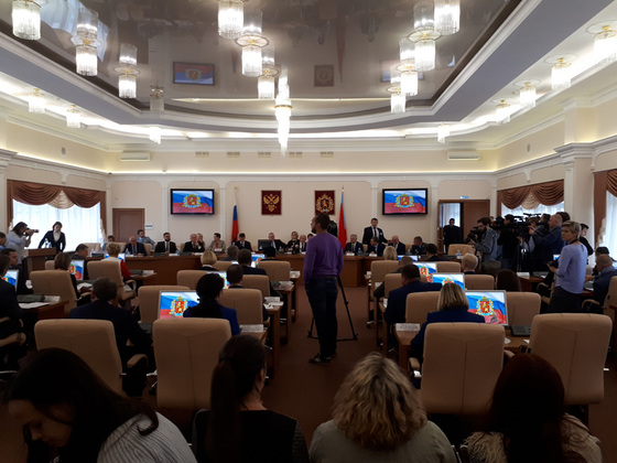 На первом заседании присутствовали 35 из 38 избранных депутатов, а также избранный губернатор Владимир Сипягин.