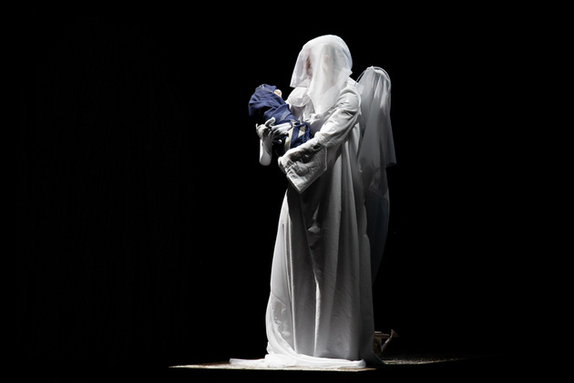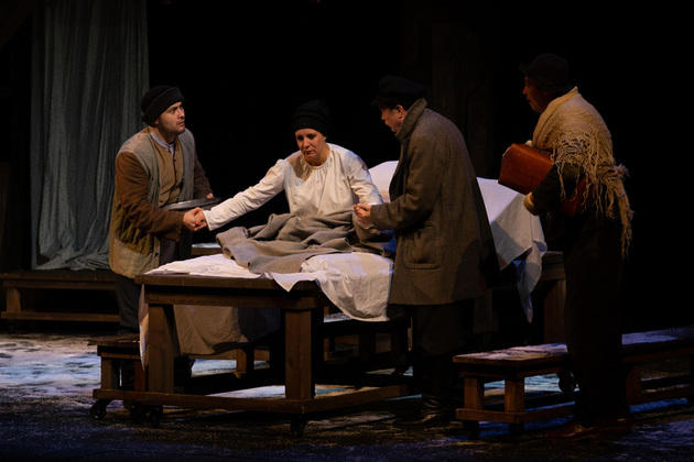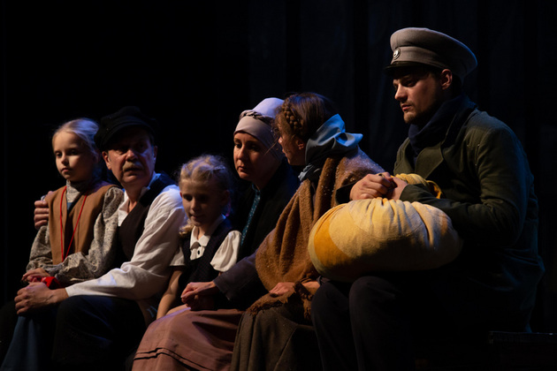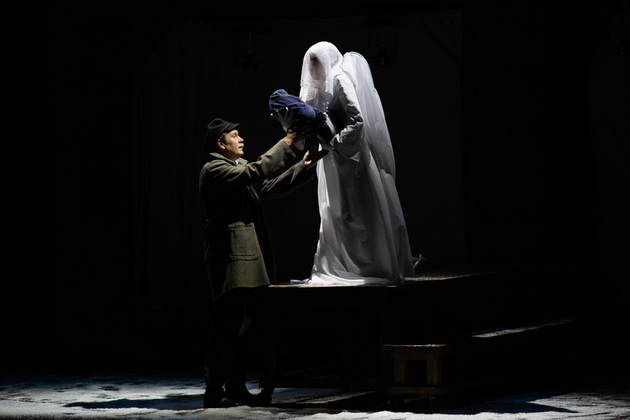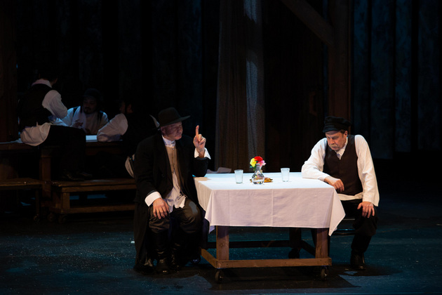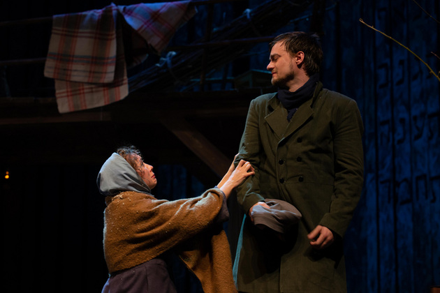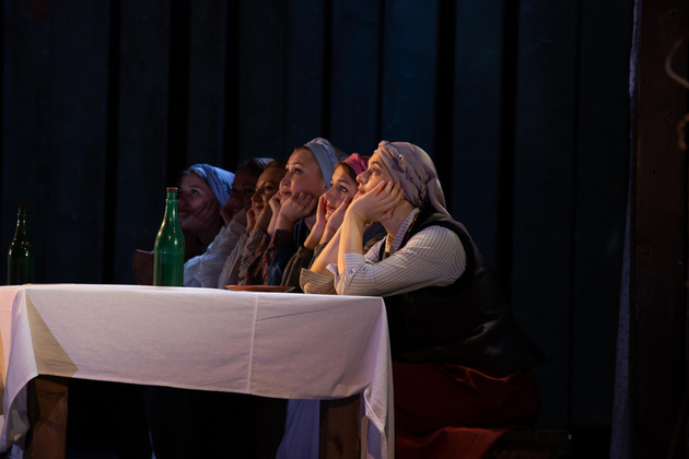Режиссер владимирской «Поминальной молитвы» — известный в России постановщик Петр Орлов, создатель десятков самобытных спектаклей в театрах по всей стране, от Москвы до Хабаровска. Во Владимире он ставил «Гамлета» в 2014-м... Конечно, ему повезло с исходным материалом «Поминальной молитвы»: Горин написал отличную пьесу с ироничными смешливыми аутентичными диалогами «а-ля Фима и Давид Гоцман» из «Ликвидации» - по-моему, похожий стиль. Плюс художник-постановщик Дмитрий Дробышев «веников не вяжет» - он вроде бы создал простой деревенский антураж, но как много мизансцен в нем раскрывается! А огромным темным фоном ко всей разворачивающейся человеческой трагикомедии красуется двуглавый орел, «обрамленный» православной иконой, с одной стороны, и строчками из Торы — с другой. В этом явно есть огромный сакральный смысл: в религиях нет таких различий, которые мешали бы людям жить вместе в добре и согласии. Доят же деревенские друг у друга коров по очереди в «Молитве», общаются, помогают, головную боль одна другому снимает... Все поводы для розни мы придумываем сами и неуклюже потом оправдываем. Кстати, при желании можно даже параллели этой истории провести с самыми разными временами, особенно когда один из персонажей говорит: «Вера у нас разная, а власть одна».