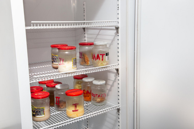 И вот мы у холодильника, где хранятся пробы того, чем кормят детей. Все баночки разложены по дням недели. Проба берется стерилизованной ложкой перед кормлением детей и хранится в стерильной банке с крышкой 48 часов. Это для Роспотребнадзора, на тот случай, если вдруг возникнет какая-то инфекция. Но, по словам заведующей, в детсаду № 12 за шесть лет работы таких случаев не было.