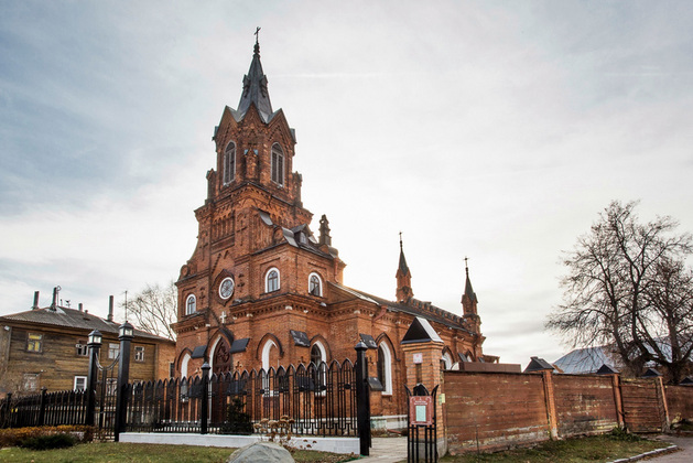 Этот католический храм был построен в конце XIX века. Католическая община Владимира и окрестностей тогда насчитывала более тысячи человек и активно участвовала в городской жизни. В декабре 1930 года храм, как и большинство других церквей, был закрыт. Настоятеля Антония Дземешкевича арестовали и в 1937 году расстреляли. Здание костела приспособили под радиотранслятор, а дом священника - под жилье для нескольких семей. В 80-х годах ХХ века живших там владимирцев расселили, а храмовый комплекс отреставрировали под выставочно-концертный зал.