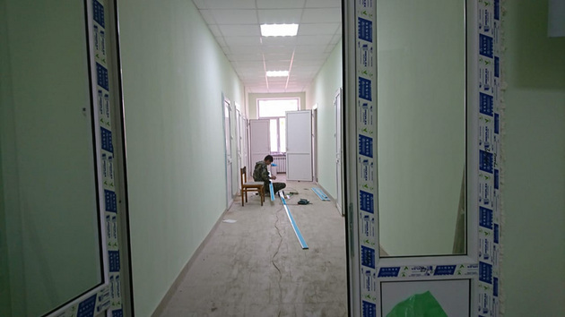 Сегодня ремонт в этом корпусе практически завершен. Губернатор Сипягин держит слово. Рабочие заканчивают отделку, вывозят мусор.
