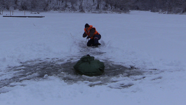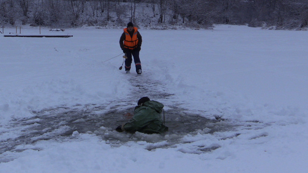Спасатели смоделировали несколько ситуаций, когда человек проваливался под лёд и показали, как правильно себя вести.