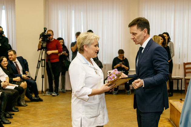 В разговоре о медицинских проблемах не были забыты и люди, которые свои м нелегким трудом помогают врачам лечить пациентов и ухаживать за ними. Речь - о медсестрах и младшем медицинском персонале. Губернатор вручил им благодарности АВО за многолетний труд и пожелал успехов.