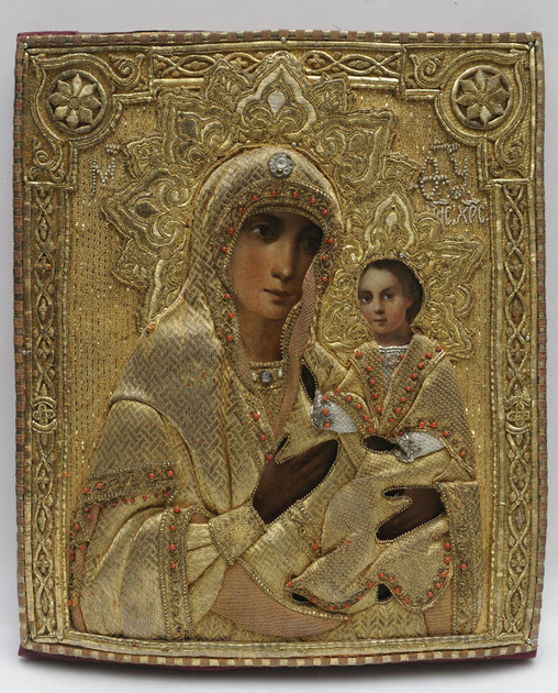 Вышивание золотом и серебром было характерно для монастырских мастерских. Две представленные на выставке иконы в ризах связаны с Суздальским Ризоположенским монастырём, в котором на рубеже XIX–XX веков активно развивалось искусство золотного шитья.