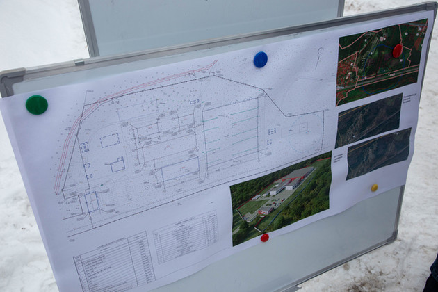 Все происходило на улице у магазина. Прямо в сугроб вкопали стенд со схемой будущего завода.