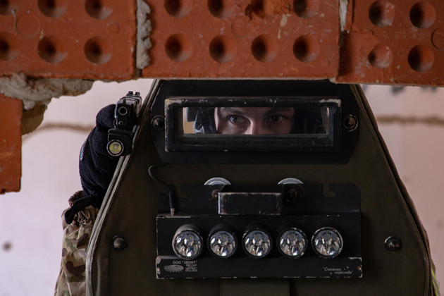 Посмотрев на то, как парни перед штурмом экипируются, я задалась вопросом: а сколько весит весь их боекомплект? Бронежилет, шлем, автоматы-пистолеты, гранаты, запасные магазины и т.д. Чуть не упала, когда мне сказали «около 30 кг». А ведь в придачу к этому идет дополнительное снаряжение. Например, есть человек с пулеметом вместо АК. Другому на каску камеру крепят (запись помогает потом анализировать детали операции). А один из бойцов работал с так называемым «досмотровым устройством «Констебль» - сами ребята называют его «удочкой»: поверх «броника» надевают еще один жилет с монитором, на который идет изображение с камеры на специальной палке (она может быть от 90 см до 3,5 и даже 6 метров). С такой «удочкой» можно заглянуть в окно или дверной проем, не подставляясь под пули. А еще два бойца в учебной операции работали «щитовыми» - то есть теми, кто на штурм заходит впереди. Так вот им еще тяжелее – во всех смыслах: идут в авангарде и прут на себе тяжеленные щиты. Конечно, у щитового всегда есть «второй номер», у которого и обзор, и маневренность для стрельбы лучше. Но все это только благодаря тому, что щитовой прикрывает и его, и себя, и всех, кто идет следом.