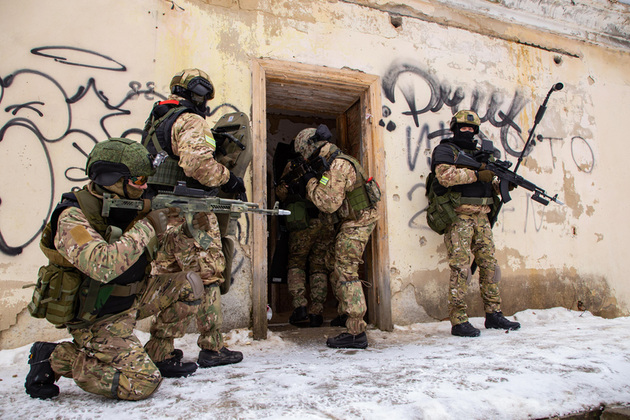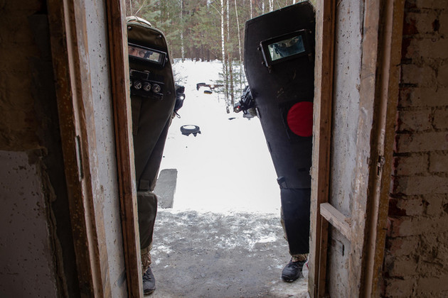 Перед учениями начальник отделения в общих чертах обрисовал суть задания бойцам: вооруженный преступник засел в здании, где конкретно – неизвестно, чем вооружен – неизвестно, каких ловушек наставил – неизвестно, но его надо найти и обезвредить, при этом обойтись без потерь. Корреспондентам велено не высовываться из-за спин ребят и приготовиться зажимать уши: грохот от выстрелов и взрывпакетов будет мощный, а пока отойти в сторонку - детальный инструктаж не для нас.