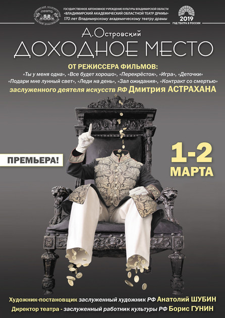 Режиссер-постановщик спектакля во Владимире — заслуженный деятель искусств РФ Дмитрий Астрахан. Он поставил более 40 спектаклей в разных театрах и снял около 30 фильмов, в т.ч. такие кинохиты, как «Ты у меня одна», «Все будет хорошо», «Подари мне лунный свет», «Любовь без правил». На владимирской сцене спектакль «Доходное место» – режиссерский дебют Астрахана.