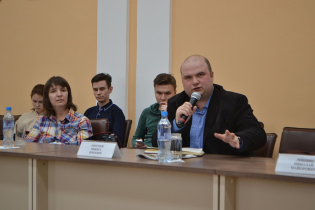 Специально для участия в круглом столе из Москвы приехал глава секретариата Союза журналистов России Денис Токарский. Он сразу расположил к себе владимирских собеседников тем, что хорошо знает о жизни «за МКАДом». Ведь Токарский — выходец с Урала, в профессиональной среде известен как издатель еженедельников «МК-Урал», «МК в Перми» и «Аргументы Недели – Прикамье», владелец интернет-газеты «Вечерние Ведомости». К тому же, Денис считает, что с репутацией журналистов в регионах ситуация лучше, чем в столице.
