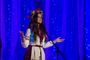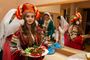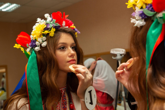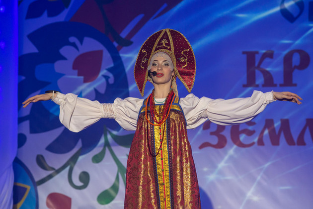 В центре сцены - в праздничном русском сарафане и кокошнике 18-летняя Арина Сураева. Арина - студентка областного колледжа культуры, родилась и живет во Владимире, но мечтает оставить след в искусстве не только своей малой родины.