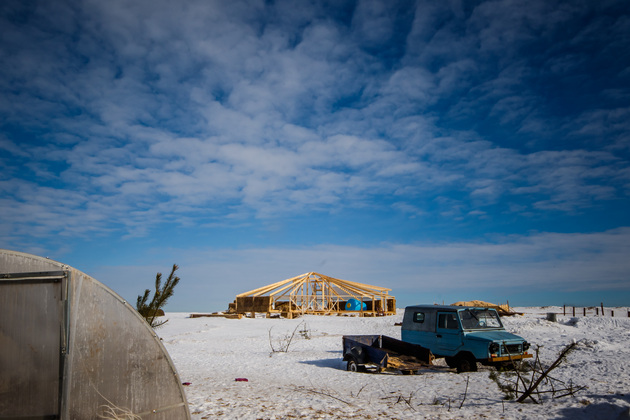 ...Мы и поехали. Трасса на Суздаль, поворот к деревне... А вот и проулок с прочищенной дорогой. Путь к утководу извилист, местами снежно-каменист. Но ничего, добрались до избушки ушельца. Вокруг - запчасти, провода, каркасы: явно нужные в хозяйстве вещи. Чуть поодаль от человеческого жилья - густо заселенная теплица-птичник. Посмотришь направо - чисто поле, налево - оно же, но с вариациями: линию горизонта прерывает какое-то чудное строение (то ли юрта гигантская, то ли ангар с секторами?).