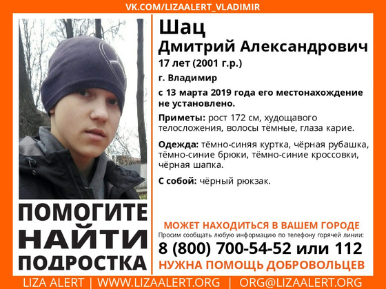Областной поисковый отряд "Лиза Алерт" просит жителей Владимирской области оказать содействие в поисках без вести пропавшего Дмитрия Шаца 2001 года рождения. С 13 марта его местонахождение не установлено.