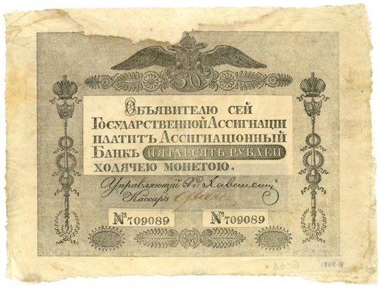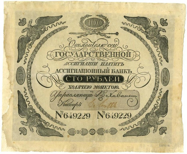 Государственный ассигнационный банк осуществил несколько выпусков ассигнаций номиналом от пяти до ста рублей, каждый из которых снабжался новыми уровнями защиты от подделки: изменение цвета бумаги, водяного знака, шрифтов и оформления. В 1843 г. ассигнации заменили новой формой денег – кредитными билетами.